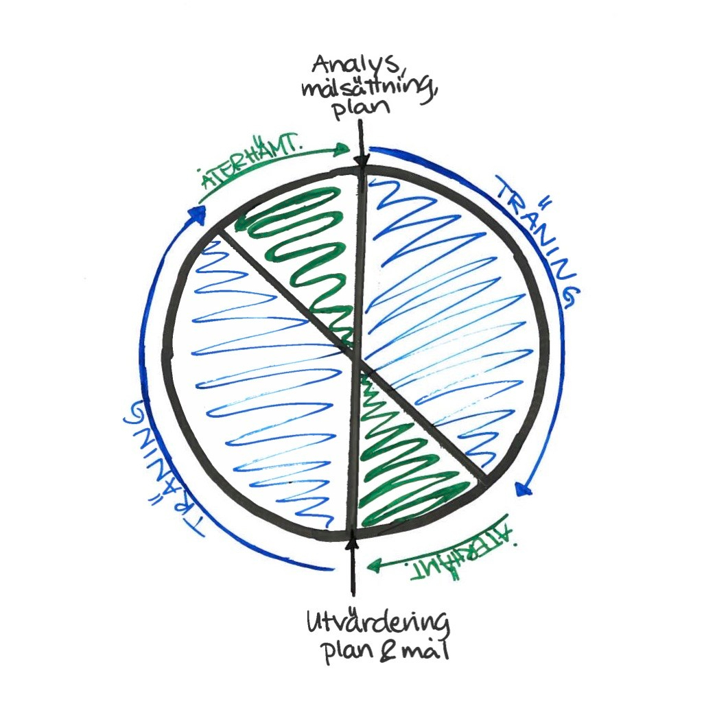 Jag gillar att rita och tycker oftast det är lättare om jag målar upp saker. Så jag ritade helt enkelt upp hur jag tänker mig att en träningsperiod ska se ut, 4 veckors träning följt av 2 veckors återhämtning följt av ytterligare 4 veckors träning och 2 veckors återhämtning. Totalt består då en träningsperiod av 8 veckors träning och 4 veckors återhämtning. Här tycker iaf jag att jag har möjlighet att vara flexibel och lägga in mer vila om det behövs. Känns det bra har jag även möjlighet att ha endast en veckas återhämtning mellan träningsveckorna, men det är helt beroende av hur Iris känns.
