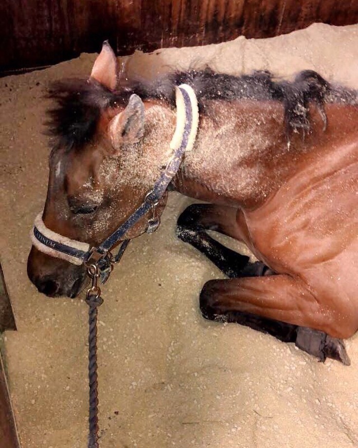 Jag släppte ut honom i hagen efter ridpasset och tog in nästa häst som skulle ridas. Precis när jag hoppat upp märke jag och min mamma att något inte stod rätt till. Lerbert stod stilla och bara stirrade på oss. Han hade verkligen en otäck blick som visade att något verkligen var fel. Han började krafsa med frambenen och drog tänderna efter vindskyddet. Något han aldrig gjort förut. Vi tog in honom direkt och försökte erbjuda honom olika vätskor (vatten, betfor mm.) som han vägrade att ta emot. Vi tog hans puls, temp, andningsfrekvens och lyssnade på tarmljud. Tarmljuden lät inte alls på höger sida och här fäller paniken in.