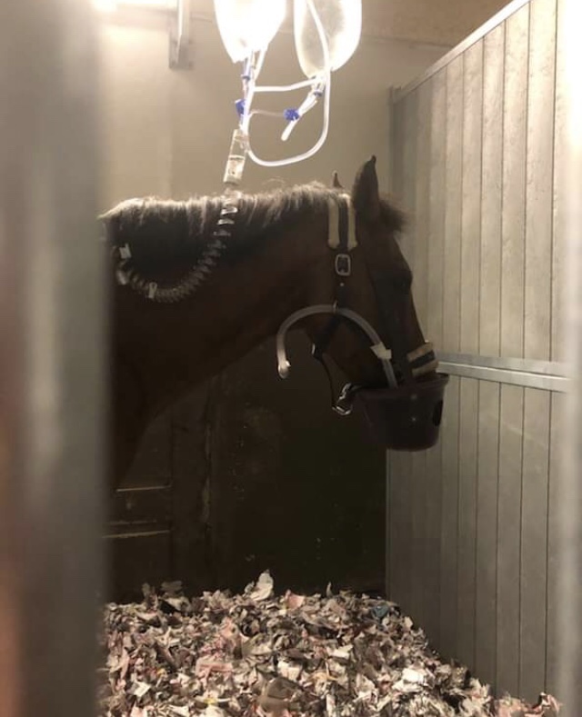 Vi ringde distrikt veterinären som kom hem till oss och genomförde en hel del undersökningar och gav smärtstillande medicin. Konstaterade att det var magen men troligen lindrigt…. Veterinären satte en sond via näsan som även blev bekymmer och troligen sprak ett stort blodkärl vilket gjorde näsblod i mängder. Det fullkomligt rann blod och det var blod överallt. Tillslut efter att ha vandrat runt på ridbanan så gav det sig. Pust.. Men Lerbert var inte bättre i sina smärtor.