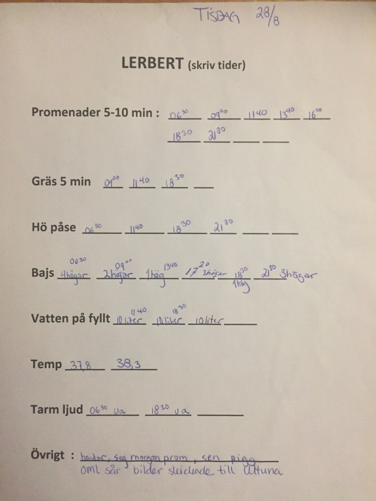Efter 6 dagar fick vi hämta hem Lerbert. 100kg lättare, smal och ynklig. Vägen nu var fortsatt tuff. Han fick inte bocka, stegra osv. Tack vare att mamma jobbade natt och kunde vara hemma på dagarna och att jag har snälla bekanta kunde vi genomföra detta schema på bästa sätt.