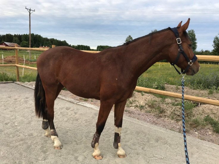 Det första halvåret fick han ta det lugnt och bara bo in sig här hos oss. Men vi har alltid gjort så med våra unghästar att vi leder dom fram och tillbaka till hagen och lyfter på hovar när vi tar in dom så att det blir en naturlig del i vardagarna.