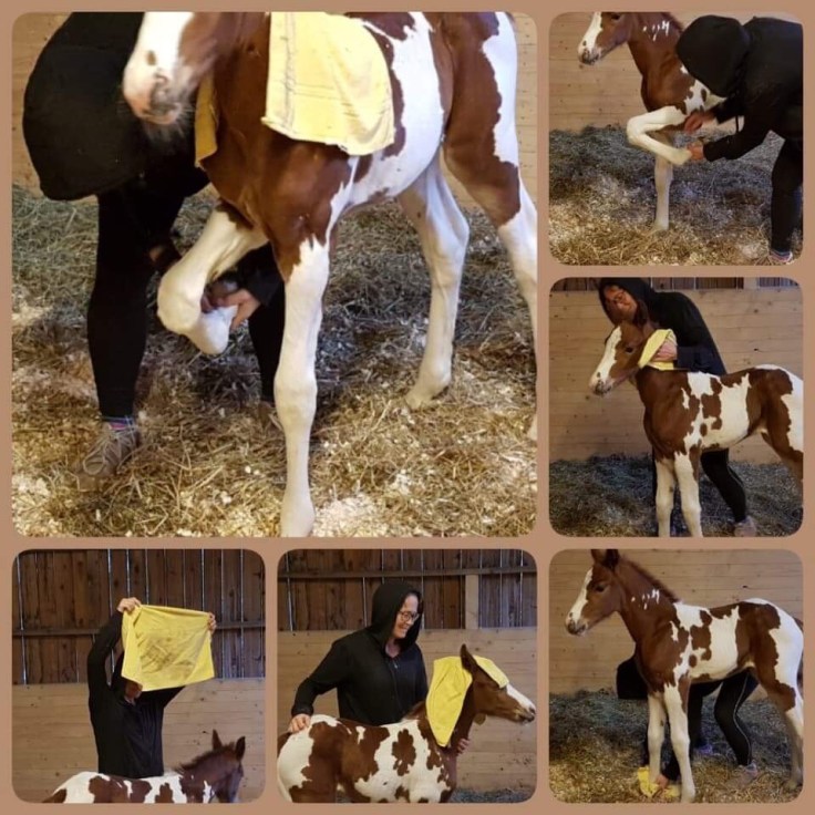-Tar en handduk stryker den överallt över henne…över huvud hals kropp och alla ben och under svansen. Är hon inte lugn så håller jag på tills hon tycker om det..( Men det har hon gjort sedan första stund😊)