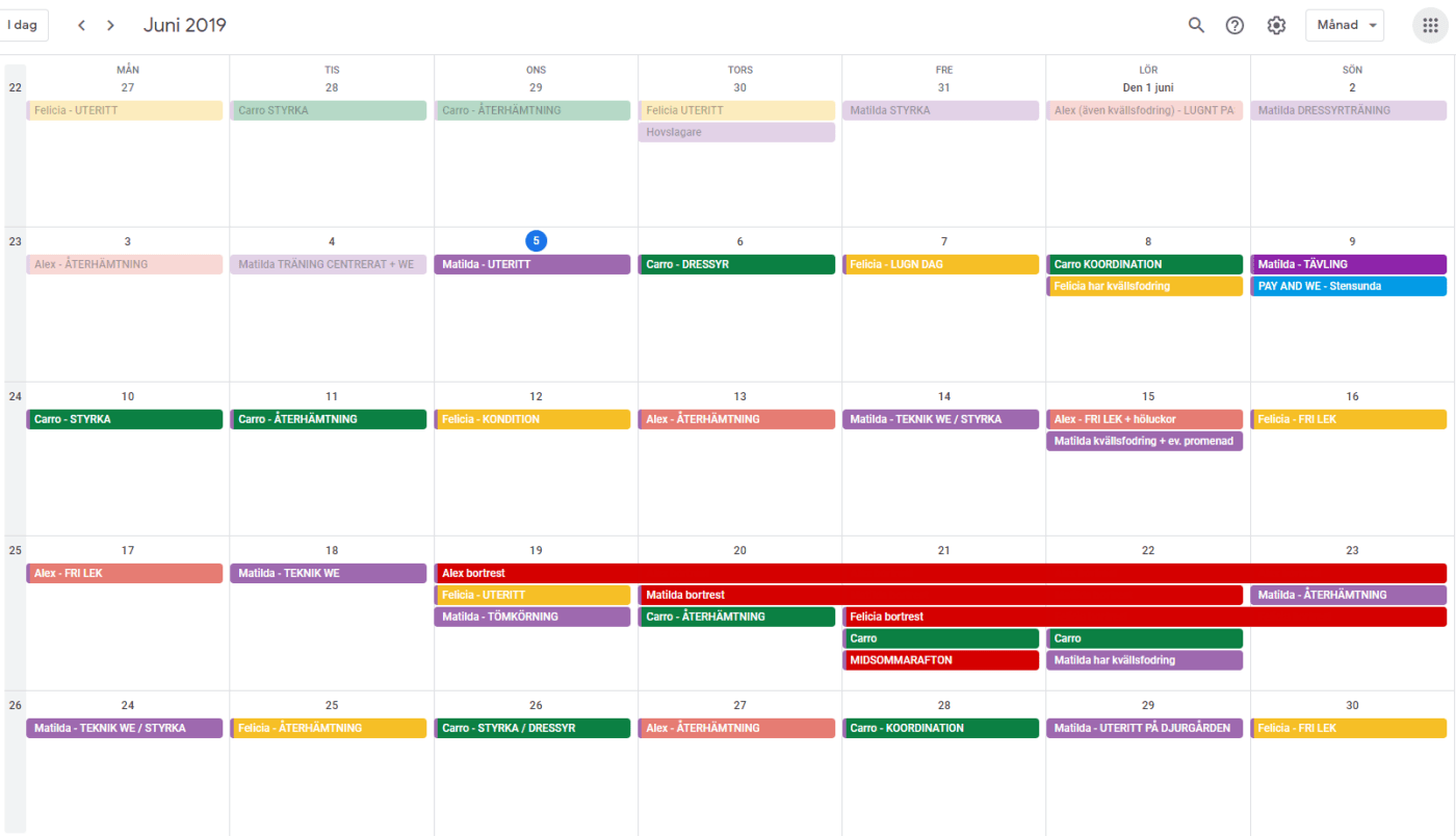 I vårt träningsschema färgmarkerar jag dagarna efter vem som har ansvar för hästen dag för dag. Vi använder Google Calendar med en gemensam kalender så att alla kan se och ändra vid behov. Efter avslutat pass för vi in anteckningar i kalendern om hur passet känts och utformats.