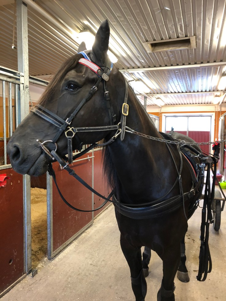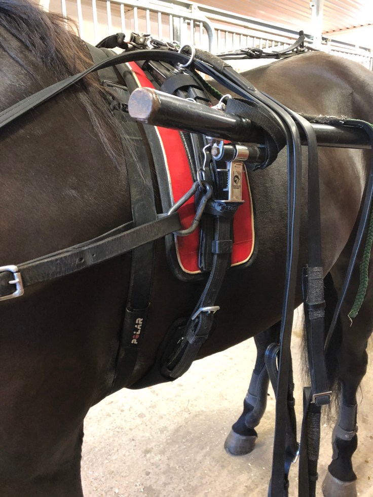 Vi har en bred brösta när vi kör med speedcar eller tyngre träningsvagn. Huvudlag och öronkappa. Ofta sitter grimmankvar under. Reflexgrimma på vintern. Knäkappor om vi ska köra fort.