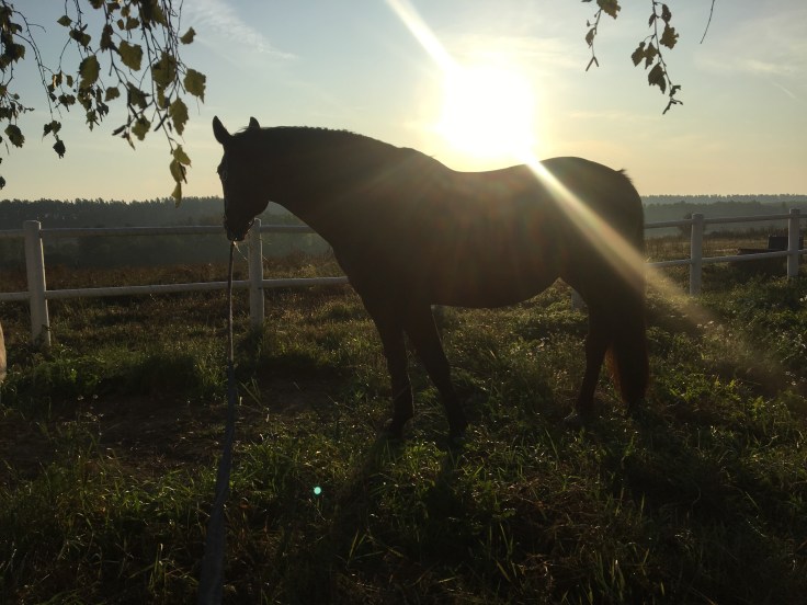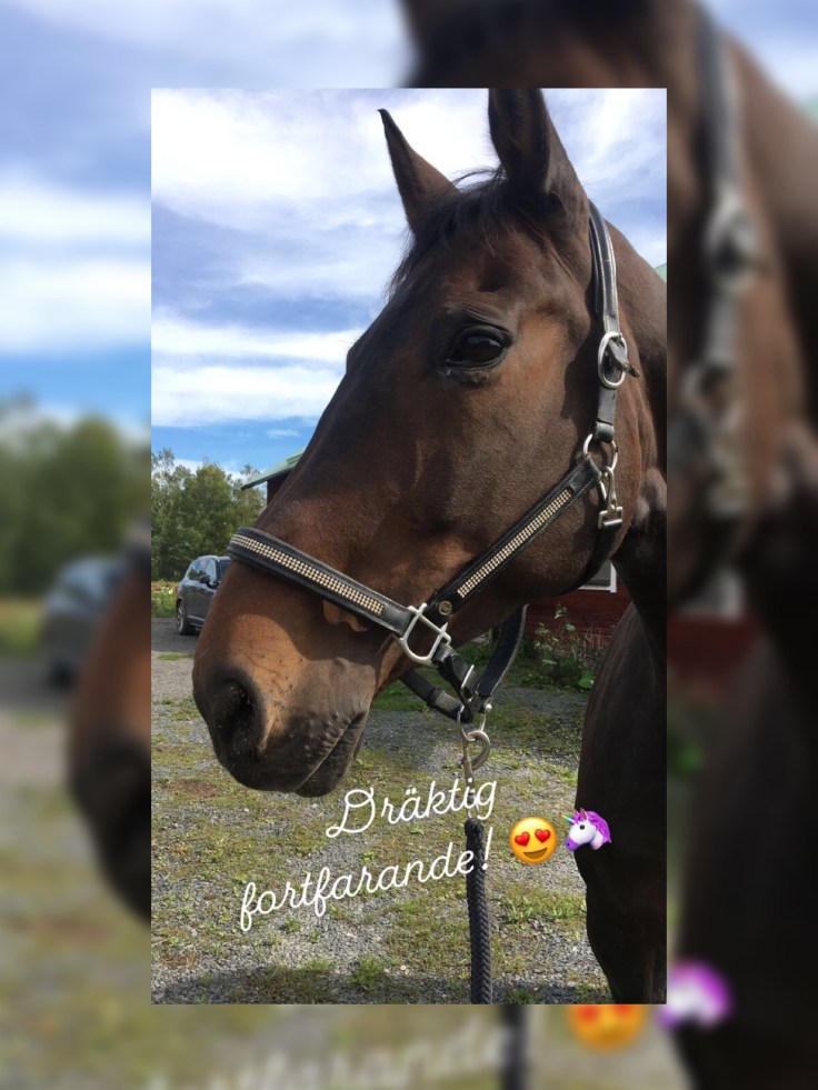 Pass 3. Skritta uppsuttet en kortare runda. När Ninja är skadad är det här passet det som först prioriteras bort på grund av den extra belastningen. Nu i sommar var det därför nästan ett år sedan som jag satt på Ninja sist. Det var helt fantastiskt att få sitta där igen och jag är inte riktigt beredd att släppa det igen om jag inte absolut måste. Den uppsuttna ridningen är dock väldigt kravlös än så länge. Mest fokus på bromsen och att Ninja ska vara avspänd. Fram över kanske jag lägger till något uppsuttet skrittpass på ridbanan med fokus på rakriktning. Det brukar göra under för lösgjordheten!”