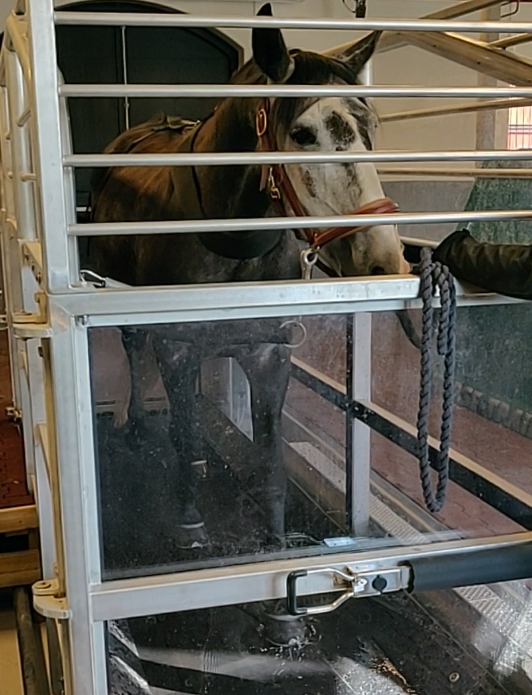 Med det sagt är både jag och personalen väldigt imponerade av hur snabbt Iris fann sig i hela situationen. Hon tyckte det var lite konstigt när bandet drog igång första gången. Lite märkligt är det att marken rör sig och att man går och går utan att ta sig någonstans. Redan under första besöket kunde vi prova med lite vatten och andra besöket gick hon i 20 cm vatten i några minuter. Hon är fantastisk min lilla häst ❤