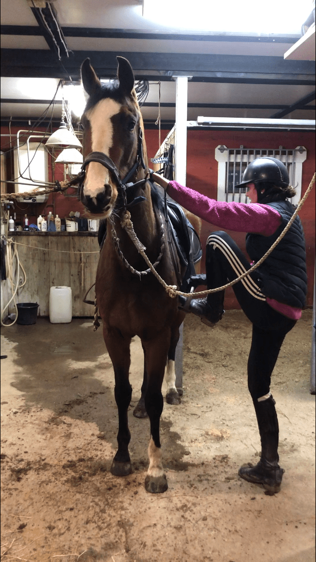 Tredje steget börja hänga och hoppa upp och ner i sadeln för att hästen ska få känna efter. Har hästen mycket sadeltvång kan det vara ett tips att alltid longera hästen innan man börjar. Jag brukar vänja mina hästar både med och utan pall och hoppa upp och av från båda sidorna. Börja med ena sidan. Sätt bara upp en fot i stigbygeln och gunga lätt, går det bra kan man lätt hoppa upp lite mer och mer tills man är helt uppe. Men gör detta några dagar innan man väl sätter sig på hästen. När du sen känner dig redo att hoppa upp helt är det viktigt att du inte sätter dig rakt upp direkt utan lutar sig fram. Klappar och berömmer sen hoppa av igen.