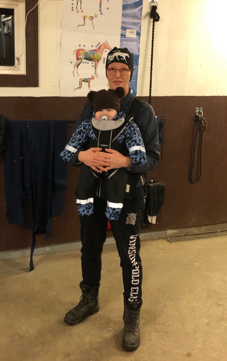 Nu har lillebror Nils blivit så stor att han också får följa med i bärselen och hälsa på hästarna