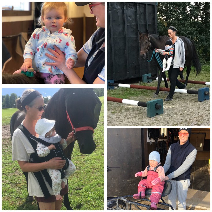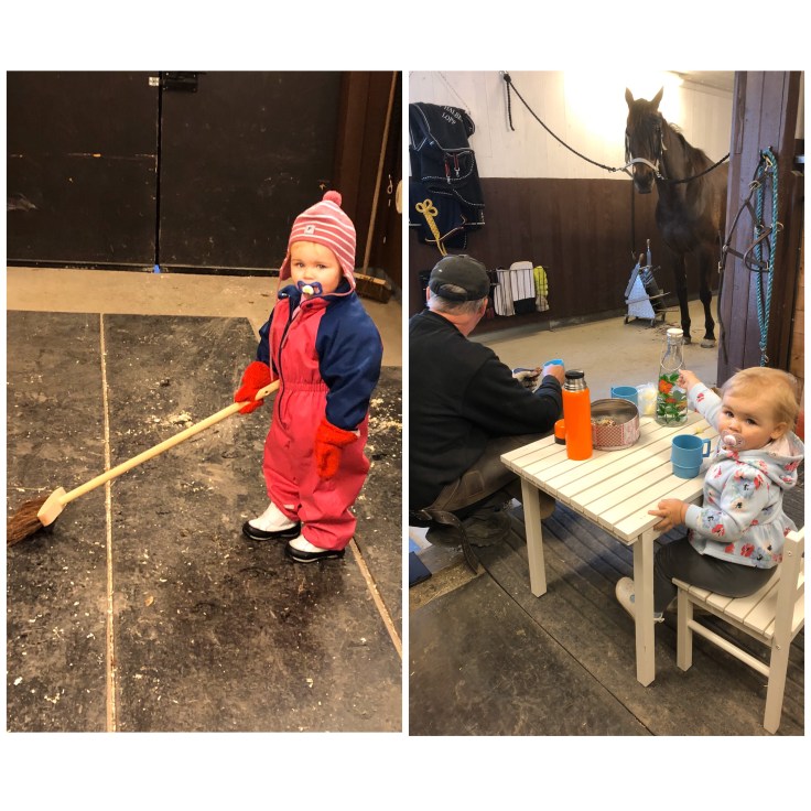 Att få möjligheten att växa upp med djur av olika slag är fint. Vi har låtit Elma var med oss i stallet sen hon var riktigt liten. I början bar jag henne i bärselen, så hon fick klappa på hästarna och i bland fick hon följa med när vi tränade lite hemma på gården.