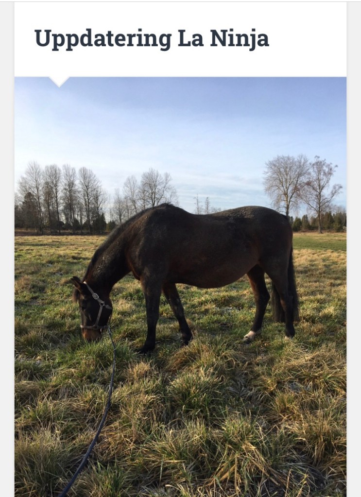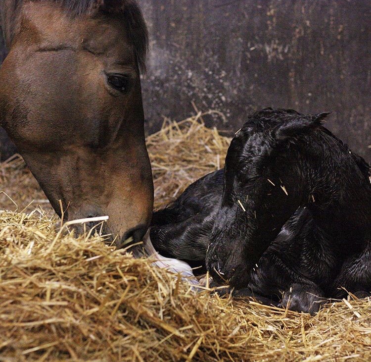 2020-04-30 föddes hon med raketfart. På självaste valborgsmässoafton och kungens födelsedag! Ett kolsvart, nätt och vackert stoföl utan knappt några tecken alls och med väldigt långa ben. Förloppet var kort, smidigt och odramatiskt. Ninja hade haft vaxproppar i ett drygt dygn och några timmar innan började hon läcka mjölk. Kl 19 kom jag till stallet, kl 19.40 la sig Ninja ned och började krysta och kl 19.45 är Kyra ute.