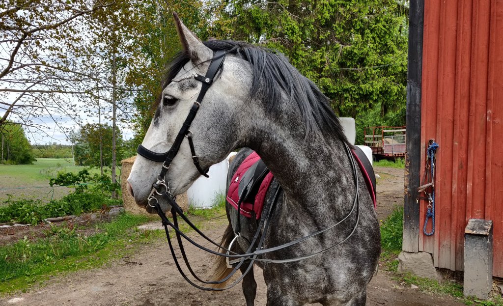 Vårt största problem har än så länge varit galoppen. Hon har tyckt det varit svårt med balansen i fattningen, vilket leder till att hon antingen skjuter iväg framåt (höger galopp) eller skjuter ifrån jämfota med bakbenen (vänster galopp). För min del så har det varit svårt att vara följsam i fattningarna, vilket då har resulterat i att jag tappat balansen och hon blir spänd och i princip drar järnet i galoppen. I och med att hon är känslig så vet hon när det är dags för galoppen, förmodligen så gör jag något som hon reagerar på, vilket då resulterat i att hon spänt sig redan innan vi ens har galopperat något. Man skulle kunna säga att det blivit en ond cirkel som vi har haft svårt att bryta.