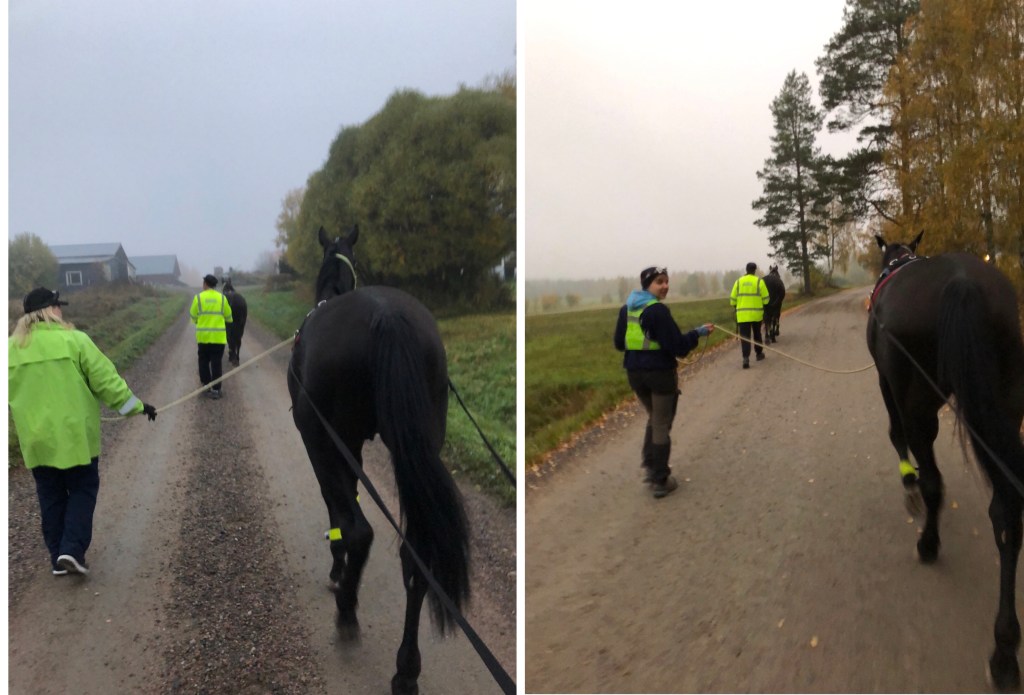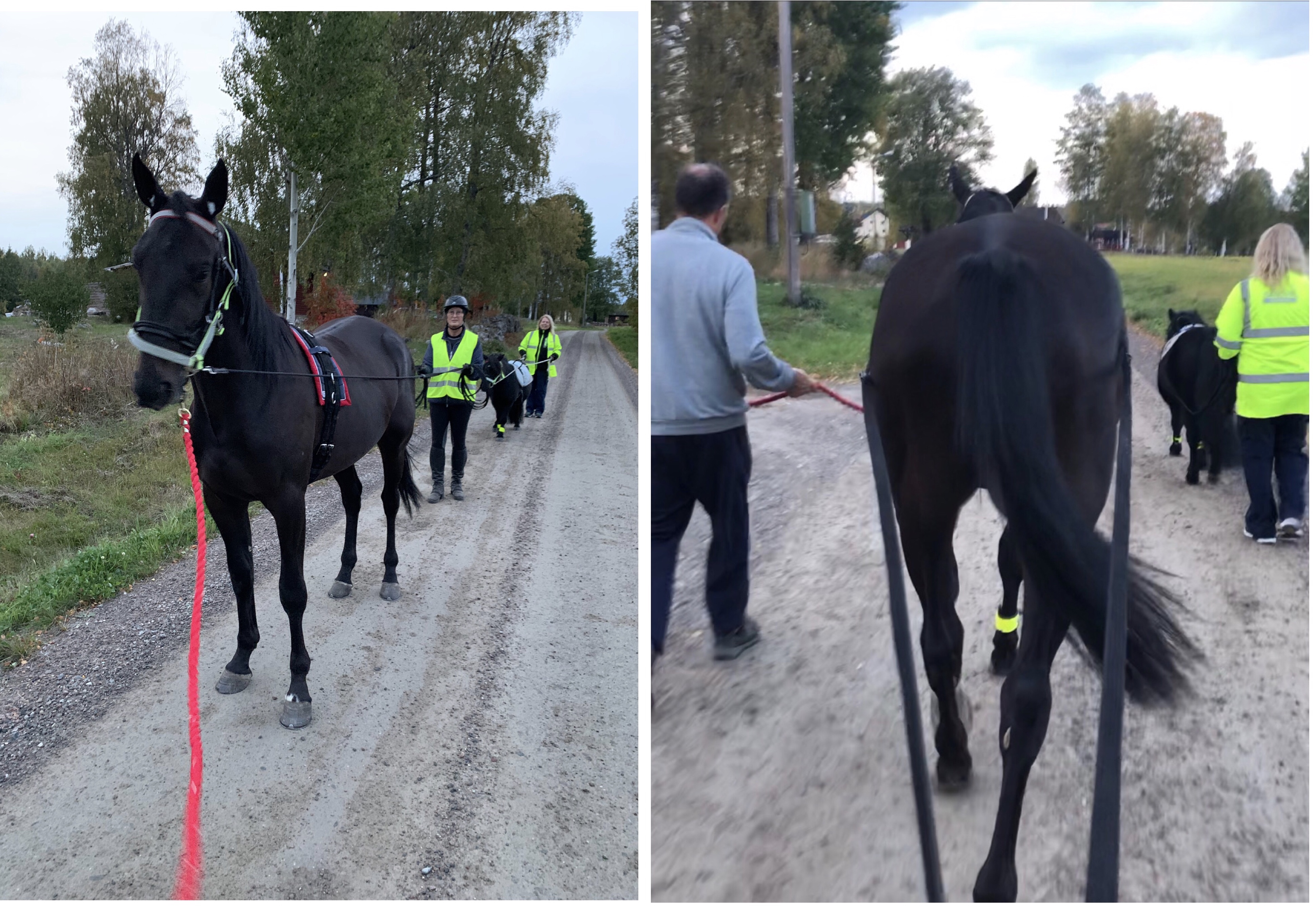 Säkerheten är viktig, så när vi började ta promenader runt om i byn fick Demo och Anna vara med som sällskap och Anders fick gå med linan. Sen övergick vi till att ha Tenzing och Anders som sällskap, Anna och Carolina har hjälpt oss med linan. Vi utökade sträckan så han fick titta på allt som finns efter vägen där vi ska köra, som tex får, höns, kor och allt annat som en häst kan reagera på.