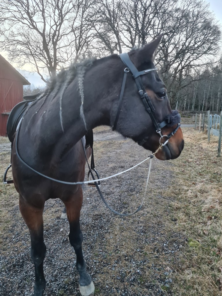 Just nu håller vi på att öka på träningen successivt och framförallt i töm. Han är överladdad och snabb som en vessla 🙈. Men igår så fick han sadel på och så gick vi en promenad. Jag tryckte ner en hjälm på skallen utifall vi skulle få feeling. Och självklart fick vi det 🥳. Jag satt upp synnerligen osmidigt och så fick han bära mig samma vända som vi nyss gått. Väldigt pigg liten häst – men också en väldigt glad och nöjd liten häst. Tanken är att han ska ridas 2ggr/v så det var väl dags att smyga igång.