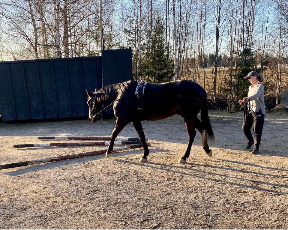 Unga hästen 10 min en gång i veckan enkelt utan intervaller och enkla övningar för hand, gärna i hage eller stallplan.