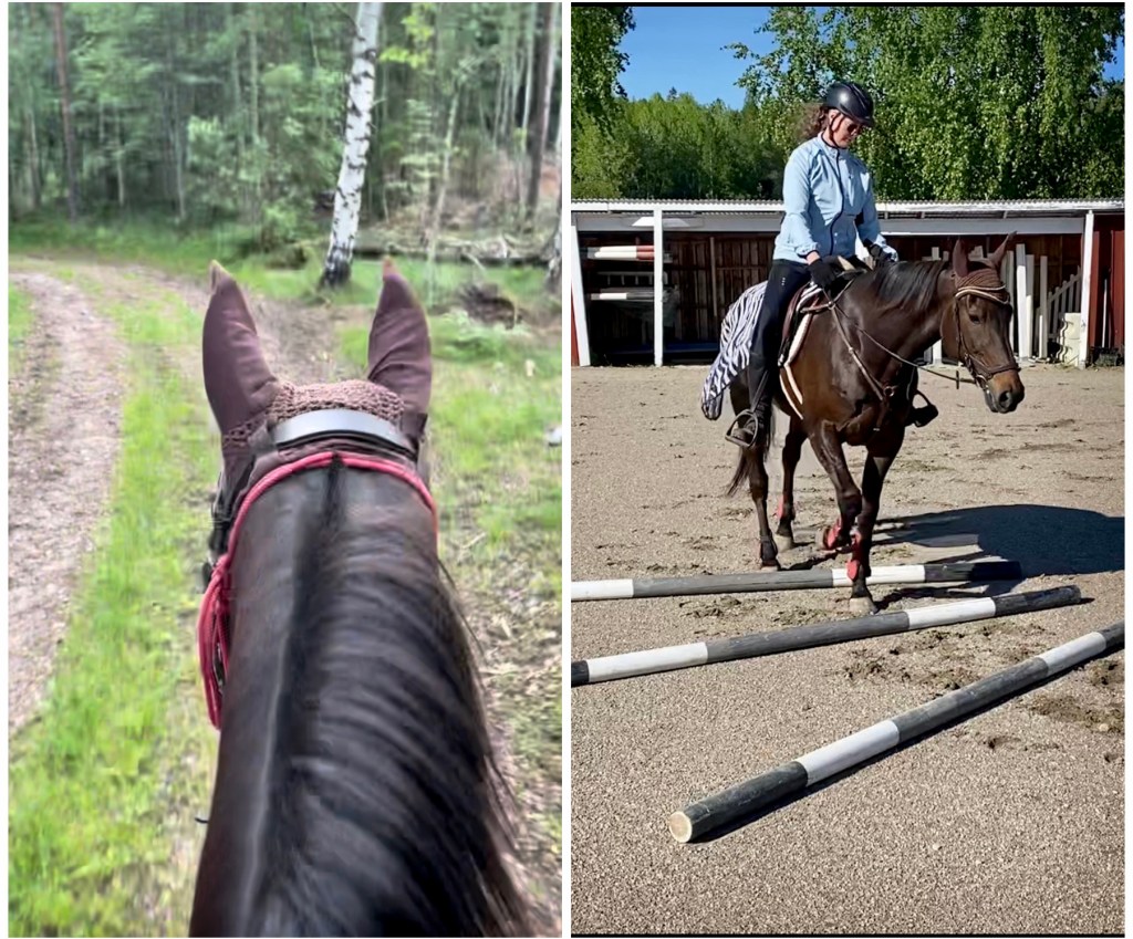 Vi tränar med Sussis uppbyggande övningar och det blir han så nöjd och trött av både i kroppen och knoppen. Nu har vi kommit så långt att det går att trava både på ridbanan och ute i skogen.