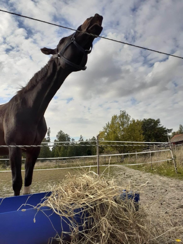 Ellan har inte förstått poängen med att stå still i en sjukhage och då ordinationen var “box eller sjukhage av boxstorlek” i 8 veckor blev det mycket tid inne i stallet för henne under hösten. Efter några veckor fick hon börja gå ut några timmar om dagen i en sjukruta byggd inne i hennes vanliga hage. Med mycket mat att äta under tiden i hagen så funkade det OK, även om hon som bonus blev att personifiera uttrycket “rund är också en form”. 😉 När vi hade haft återbesöket 8 veckor efter operationen fick hon gå ut i sin vanliga hage. Lycka!
