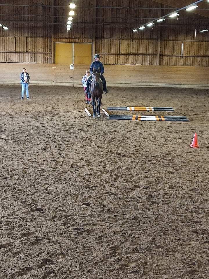 Hans och min travkarriär tog slut samtidigt och starten på en rid karriär började, vi kunde väl ungefär lika mycket han och jag. Vi kämpade på i skogen men utvecklingen stod stilla och skadorna fortsatte. 2022 fick vi tips om Susanne Widner. Utan att riktigt veta vad jag gav mig in på åkte vi, i början av augusti 2022, till Pärlbygård för vårt första SWUS-läger. Dit kom vi med en lite sne ojämn häst som fortfarande hade en travares kropp och gångarter. Men vi trivdes som fisken i vattnet på detta läger. Fulla med nya kunskaper åkte vi hem och fick order om att köra 10×4 rakriktningar, i skritt, i fyra veckor. Sagt och gjort det tog lite tid, och helt ärligt inte alltid jätteroligt att köra rakriktning 10×4, men vi kämpade på dessa fyra veckor. Och när resultatet på dessa fyra veckor kom var jag frälst!