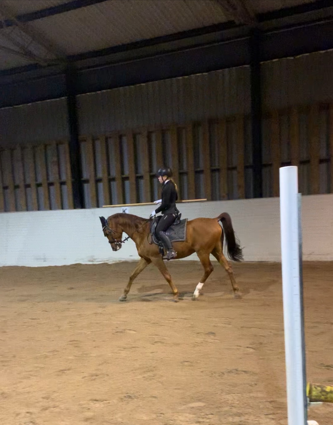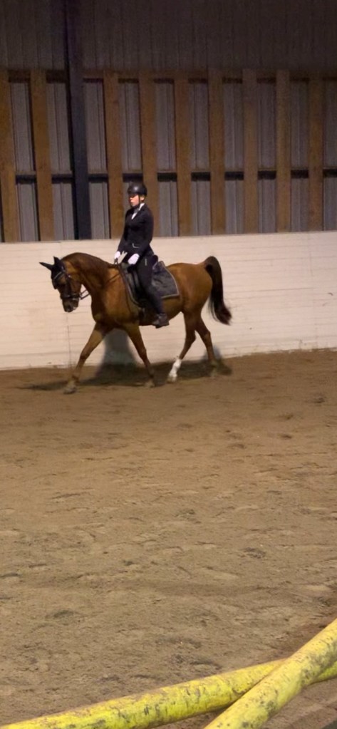 Att ta sig iväg till ridhuset har varit svårt utifrån rådande väglag. Risken för att hamna i dike väljer jag medvetet bort och hittar då träningsmöjligheter hemma. Under denna vinter har jag och Megalo haft fokus på att ”gå fram” och få honom att släppa den mentala handbromsen. För att lyckas med det ute har målet främst varit att han skall bjuda framåt i både traven och galoppen. Traven har fungerat ok tidigare men i galoppen har det främst blivet avbrott utifrån att han reagerat på andra saker. Denna vinter så började vi med något så enkelt som att som att Megalo får ej bryta av fast han blir bekymrad och blir det korsgalopp så har vi bara galopperat vidare. Detta har gett en god effekt vilket märks betydande när vi varit i ridhuset och tränat. Där har han nu slutat att bryta av så snart du ber honom att böja sig eller liknande samt att han vågar fortsätta hålla sin galopp när det blir jobbigt. Vi har tack vare denna medvetna handling skapat en förändring som Megalo gynnas av både psykiskt och fysiskt.