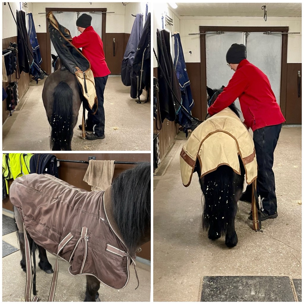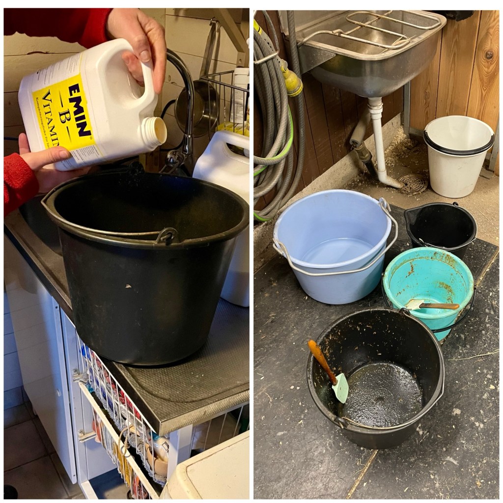 ¤ Rengöra hinkar och byta från stalltäcke till utetäcken på alla 3 innan dom släpps ut i hagen.