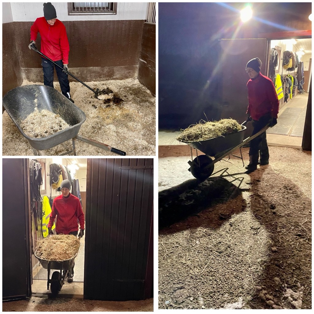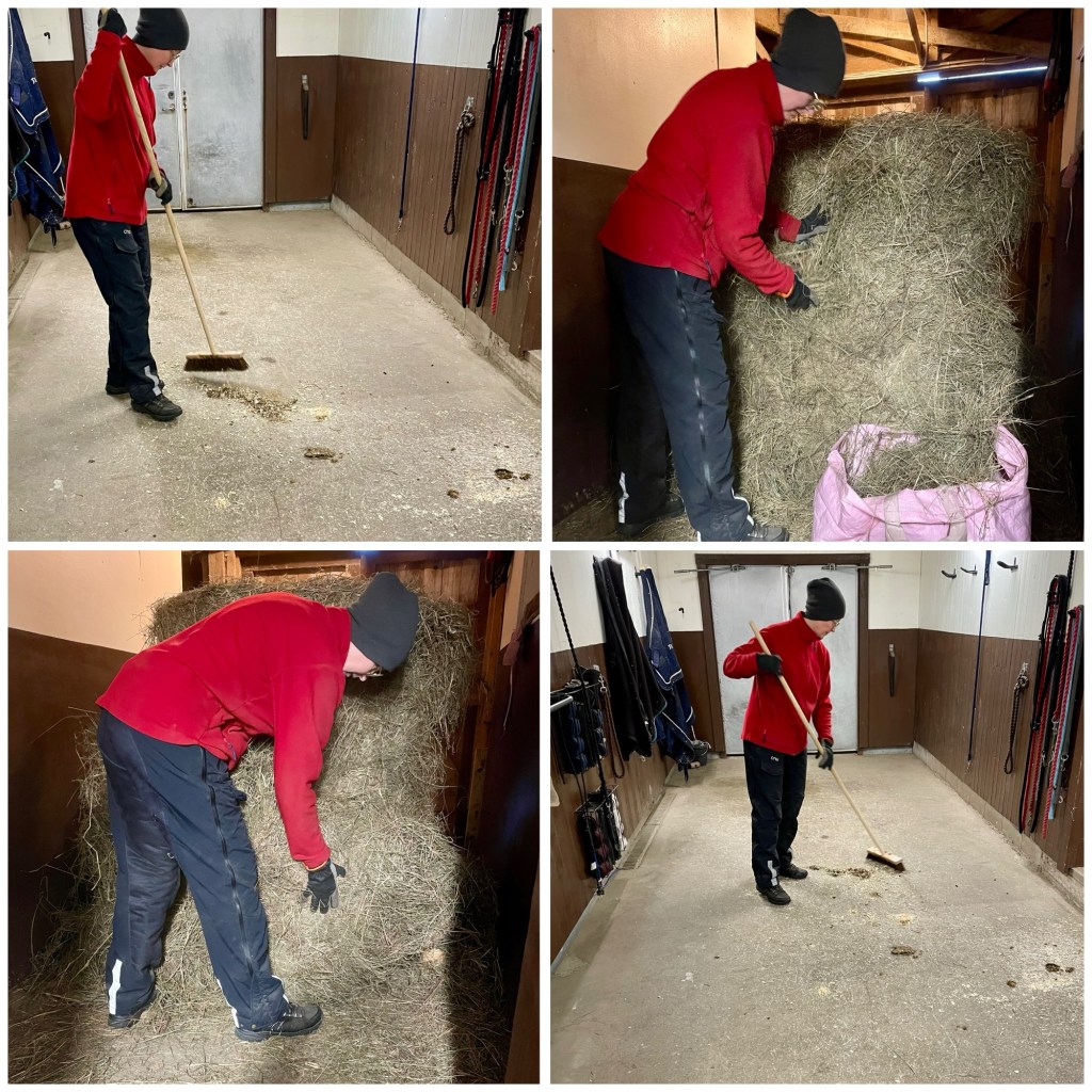 ¤ Fylla på hö i boxarna och sopa golvet